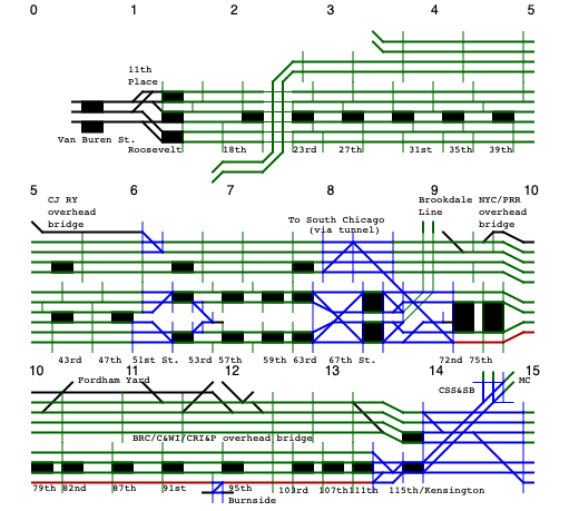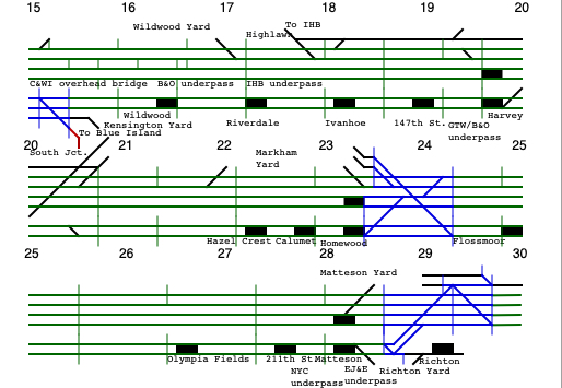 Former Illinois Central main line in Chicago area, as it likely existed during 1950's. Information is based on a 1942 track chart, along with notes and observations made during 1970's. Spacing shown between tracks indicates the separate through and commuter tracks, and does not indicate actual spacing between tracks. Route basically included from west to east 2 or 4 or 6 electrified commuter tracks, 2 through passenger tracks, and 2 freight tracks. In 1962, outer two commuter tracks were removed between Roosevelt Road and 51st St. And in 1968, CTC enabled removal of freight tracks north of 67th Street. Signal support structures had remained in place after these projects. Also in 1964, bidirectional signals were installed on the commuter tracks between Kensington and Homewood, apparently economically by lengthening many blocks. In 1977, bidirectional signals were installed on the commuter tracks between Homewood and Richton, at the same time the commuter service was extended south to what now is University Park. And in later years, additional bidirectional signals were installed on the passenger tracks, and signals were removed on many segments of the freight tracks.