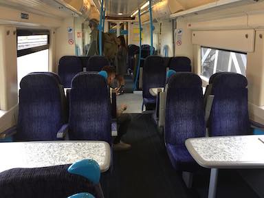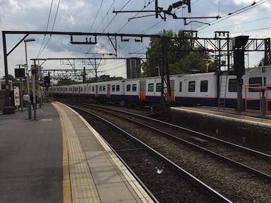 I rode an Overground train from Stratford to Hackney Central. Where a transfer connection is available to the pictured Hackney Downs station, where I would ride a train into Liverpool Street station. The Overground trains, like the Underground trains, had sideways seats.