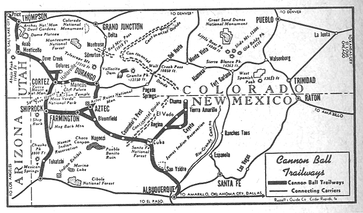 Began operations in 1929 as Cannon Ball Stage Lines, in 1944 joined Trailways, sold 1953 to Transcontinental Bus System/Continental Trailways.