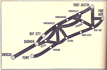 Map does not show main route west into Chicago. Formed 1910 as Phillips-Taylor Livery Service, soon renamed Owosso-Flint Bus Line, renamed 1935 to Indian Trails Bus Lines. Indian Trails continues in existence.
