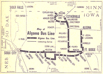 Was Charter Coach Co. until 1946, original route was Sioux City-Estherville. In 1954 acquired Algona Bus Line. Operated until 1962, with Sioux City-Spirit Lake route sold to Midwest Coaches, and Sioux City-Fort Dodge route sold to Iowa Coaches.