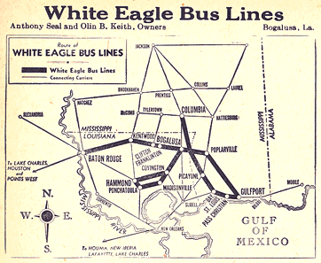 In 1948 acquired Moak's Bus Line, with route in Mississippi Woodville-McComb-Hattiesburg. Operated until 1953, with Bogalusa-Covington route sold to Teche Greyhound Lines, and former Moak's route sold to Arrow Bus Lines.