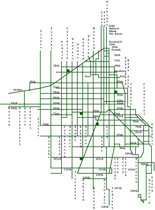 Green circles indicate CTA bus garages. In addition, North Ave. and Forest Glen housed the remaining trolleybuses, as indicated by the multicolored circles.