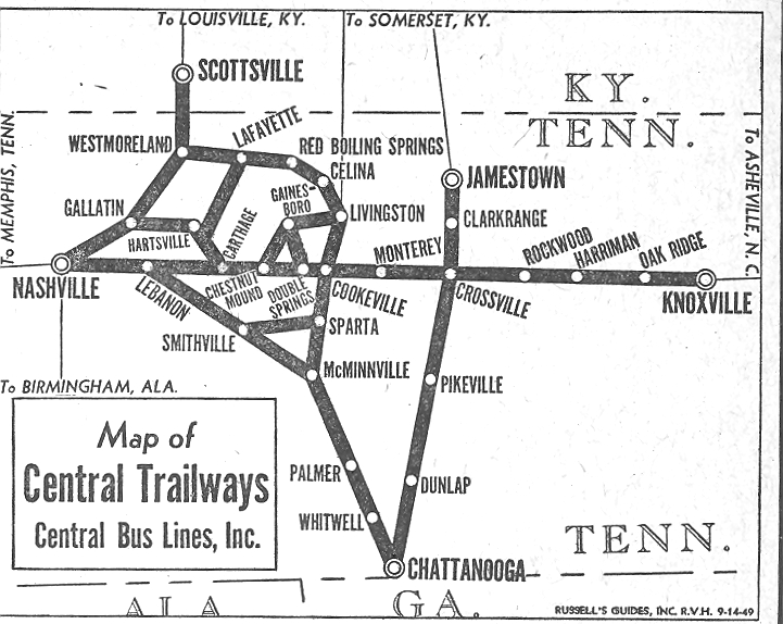Incorporated 1934 as Cookeville Coach Co., renamed 1935 to Central Bus Lines, in 1946 joined Trailways, sold 1954 to Transcontinental Bus System/Continental Trailways. In 1947 acquired Consolidated Bus Lines, which had been incorporated in 1926.