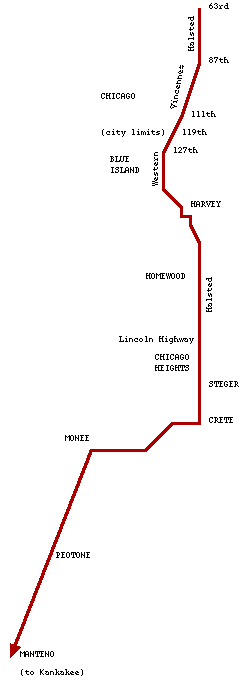 Route began at 63rd St./Halsted St., and operated south via Halsted and Vincennes, exiting Chicago city limits at 119th St. into Blue Island. Continued south through Blue Island, Harvey, Chicago Heights, Crete, west to Monee, and southwest paralleling the Illinois Central Railroad to Kankakee.