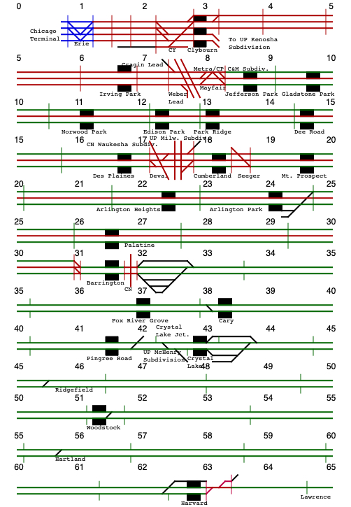 At Crystal Lake Jct. is the junction with the McHenry Subdivision, which originally connected with the old Galena Division further south.