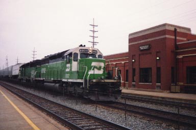 In 1993, a westbound BN freight past proceeds through Downers Grove.