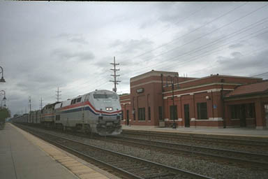 Amtrak's "California Zephyr", westbound from Chicago, speeds past the Downers Grove Metra station.