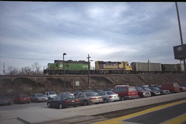 In 1997, shortly after the BNSF merger, Burlington Northern rebuilt GP7 #1438, and Santa Fe GP39-2 #3690 lead a local freight eastbound through Aurora, on the embankment above the station.