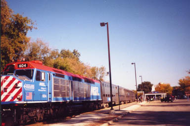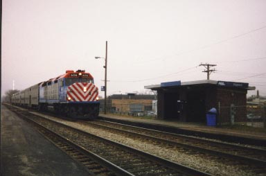 A northbound Metra train arrives at the Grayland stop on Chicago's northwest side. At the time, the train was operating on the left hand track.