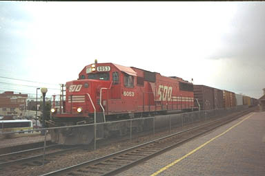 Most of the freight traffic on this line is between Tower A-20 and Rondout. A lone SD60 #6053 has a northbound Soo Line freight train through Deerfield, in 1994.