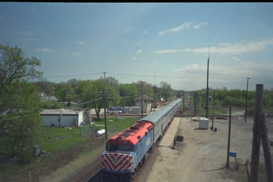 Looking north from the bicycle trail bridge, the branch to Fox Lake can be seen diverging to the left. The branch has fresh ballast, as at the time in 1994, major track work was being performed. This track work resulted in substitution of buses beyond Rondout during off peak hours, while the trains are seen stored in the sidings on either side of the double track main line to Milwaukee.