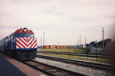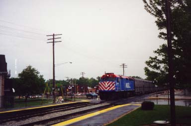 A Metra train at the Wrightwood station, near Norfolk Southern's Landers Yard.