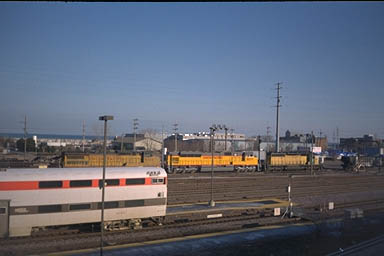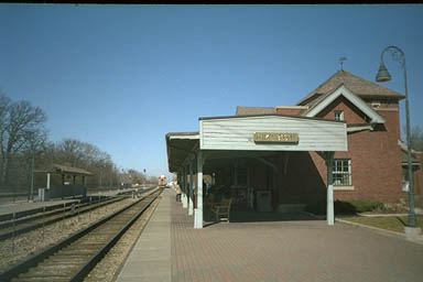 At the Waukegan station, where a Metra train is visible, along with Union Pacific and former Chicago and North Western freight locomotives in the yard. Lake Michigan is visible in the background.