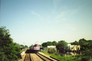 View from the front of a southbound Metra train, as a northbound train is seen stopped at Evanston's Central Street station.