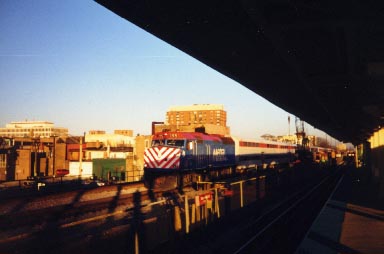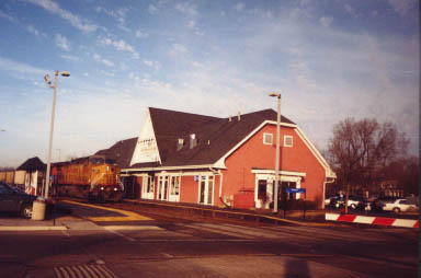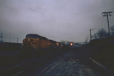 Further west in Wheaton, it is dusk one winter day in 1997. An eastbound freight is standing on the center track, with AC4400CW #6884 leading. Meanwhile, an eastbound Metra train approaches on the outside track. Above the Metra train is the old Chicago Aurora and Elgin Railroad bridge.