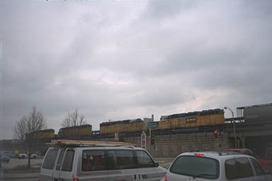 Freight activity is heavy on the Union Pacific West Line. An freight is seen, eastbound though Oak Park, on the elevated embankment.