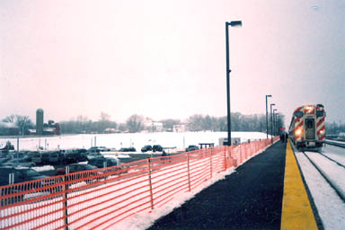 A Union Pacific West Line Metra train at Elburn, during the first week of operation of the extension beyond Geneva, January 2006. The barn to the left indicates the rural character of the area at the time of the extension. But that farm had closed, and would later be replaced with new suburban construction.