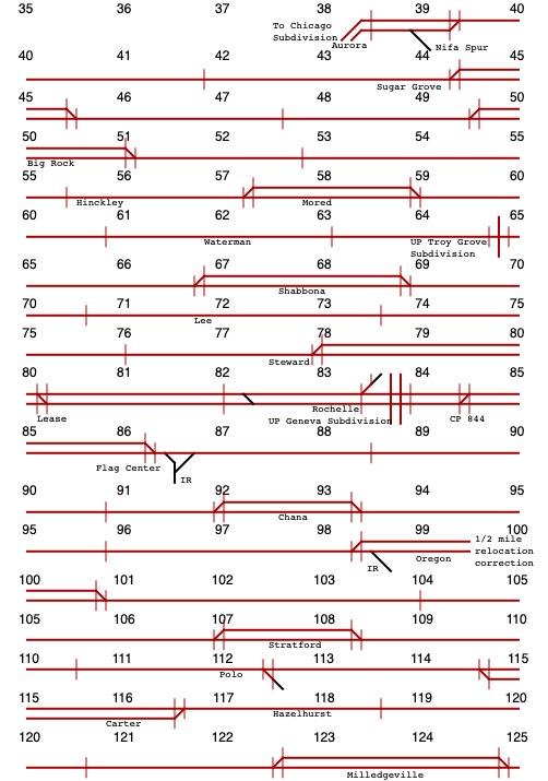 Originally the line proceeded from Oregon to Mt. Morris and Forreston, before the line was constructed to St. Paul. The original line northwest of Oregon then became a branch.