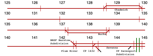 1 track, CTC in use, controlled by "C&I" Dispatcher in Fort Worth, Texas. 2 tracks between Steward and Flag Center, and between Plum River and Savanna.