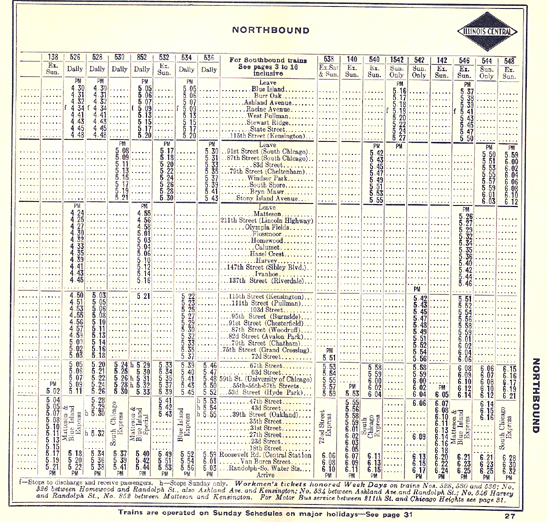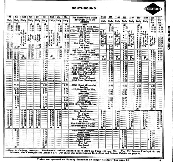 Pages of a 1939 timetable. Schedules for all different days of the week were lumped together. At the time, trains on the South Chicago Branch operated every ten minutes throughout the day.
