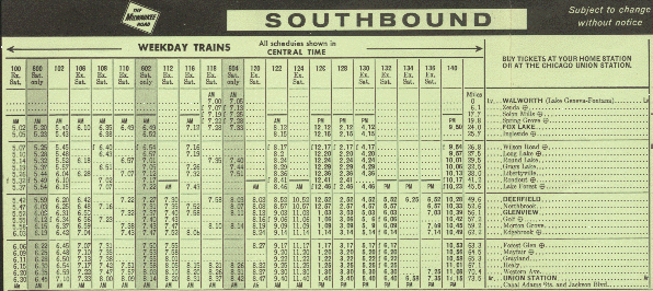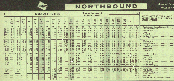 Portions of a 1971 timetable. At the time, a few trains operated beyond Fox Lake to Walworth, Wisconsin.