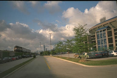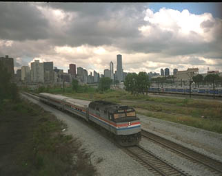 Amtrak's "Pere Marquette" speeds south away from Union Station past US Cellular Field, on its way to Grand Rapids, Michigan.