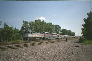 Amtrak's Hoosier State heads north over Union Pacific tracks through Dolton, on its way from Indianapolis to Chicago. The Superliner car behind the locomotive is being shuttled north from Amtrak's Beech Grove shops in Indianapolis, as often done with this train. Photo was taken in 1993, before the Hoosier State was discontinued, and later reinstated.