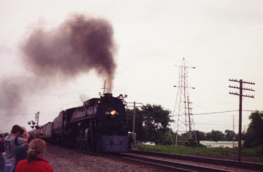 Not an Amtrak train. But along the route near Kewanee, Illinois, Milwaukee Road 4-8-4 #261 is seen westbound on a photo run by, on an excursion trip to Galesburg on May 21, 2000.