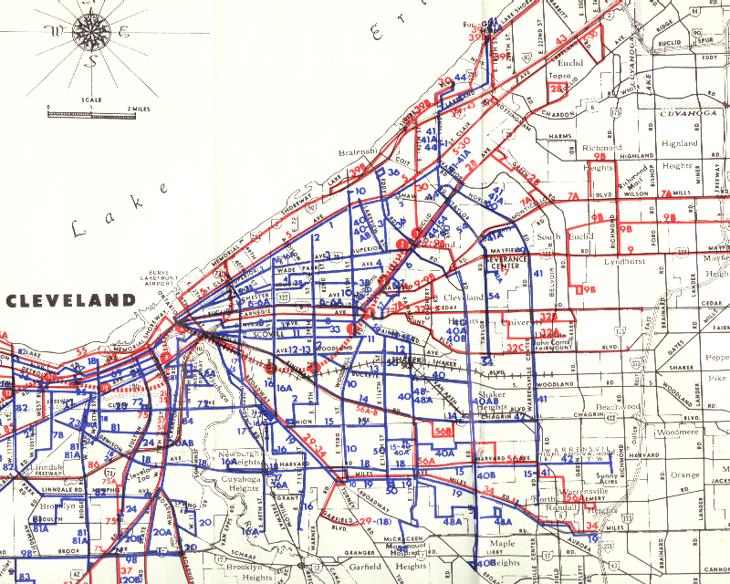 Blue indicates local routes, red indicates express routes. Thick red dashed line indicates the rapid transit line, now the Red Line. Also shown is the Shaker Heights Rapid Transit, as a think black cross hatched line.