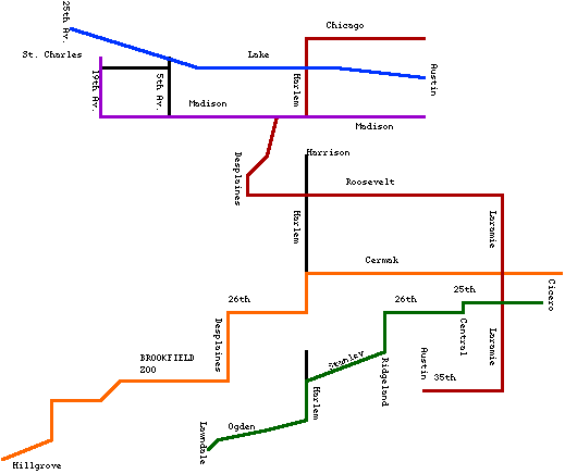 10 - Madison Street (Pace 310/303/320) - operated between Oak Park and Maywood, converted to buses 1947. Shown in purple.