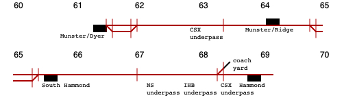 1 track from Hammond to Munster. CTC in use, controlled by dispatcher in Michigan City.
