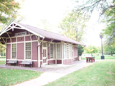 Elmhurst (16.8) - station was located east of York Road on the north side of the tracks, and south of paralleling South St. The station building has been preserved. At that location, the Chicago Aurora & Elgin Railroad, now the Illinois Prairie Path, paralleled to the south.