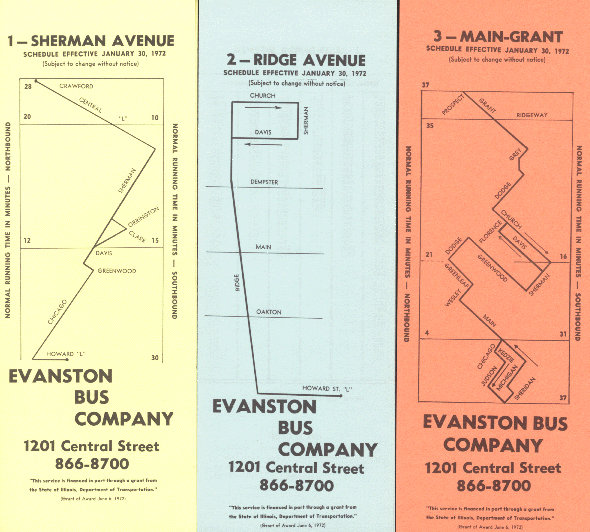 From the last Evanston Bus Co. timetables, schedules for Routes 1 and 7. Route 1 evolved into CTA Route 201, while Route 7 became CTA Route 204, which existed until 2003.