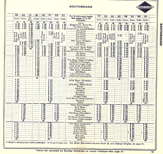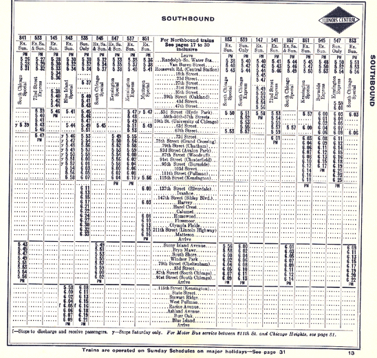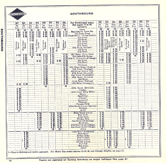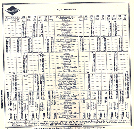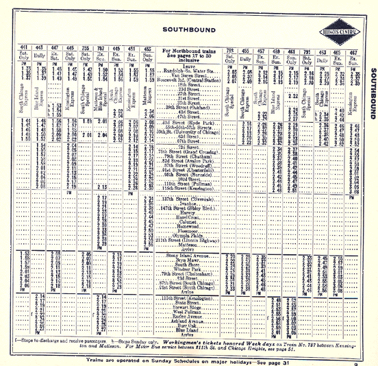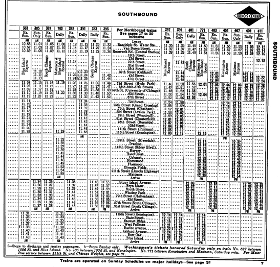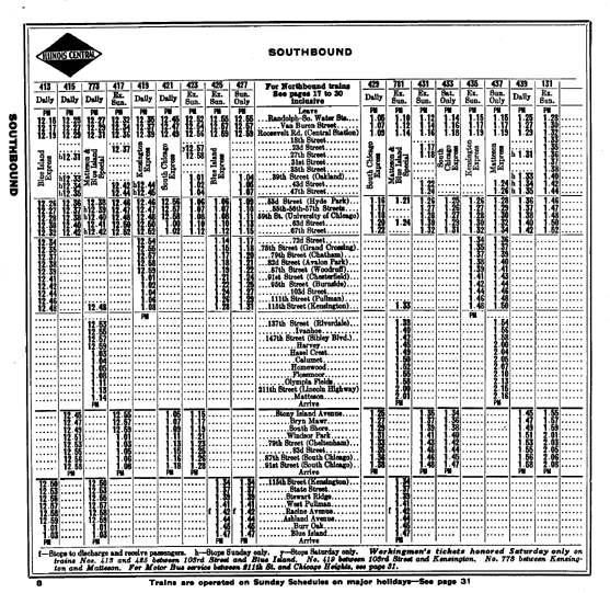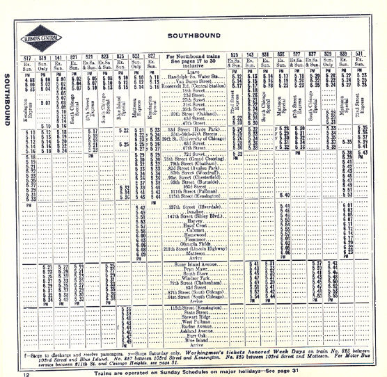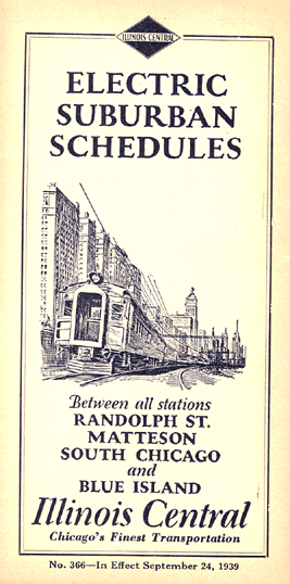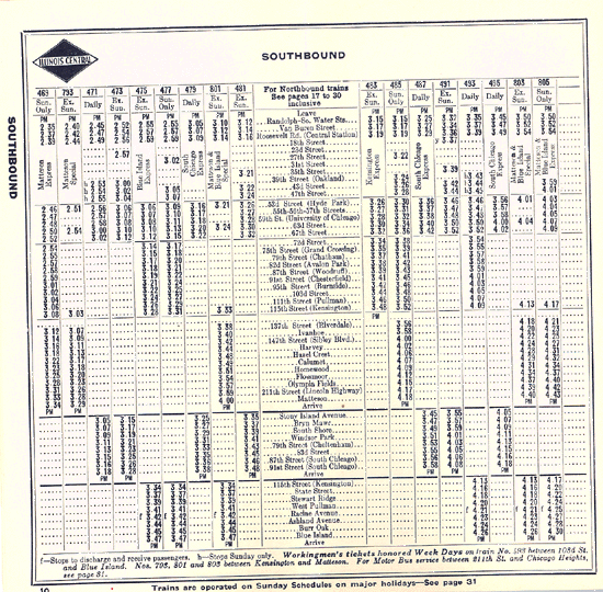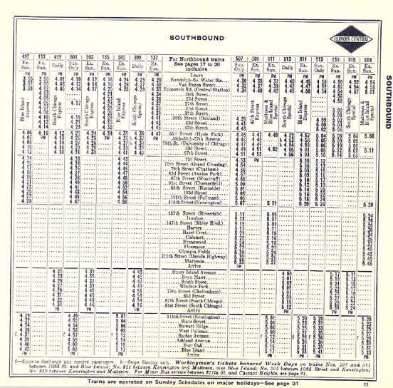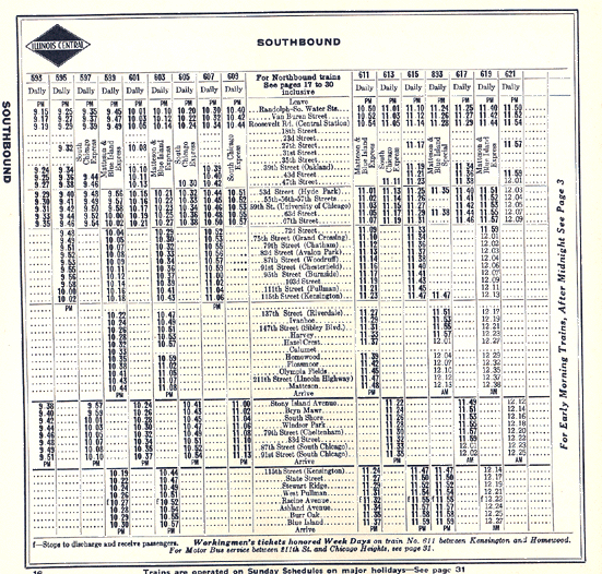 Pages of a 1939 timetable. Schedules for all different days of the week were lumped together. At the time, trains on the South Chicago Branch operated every ten minutes throughout the day.