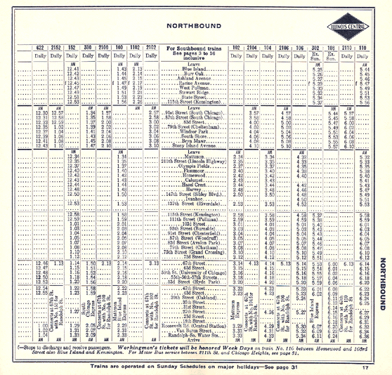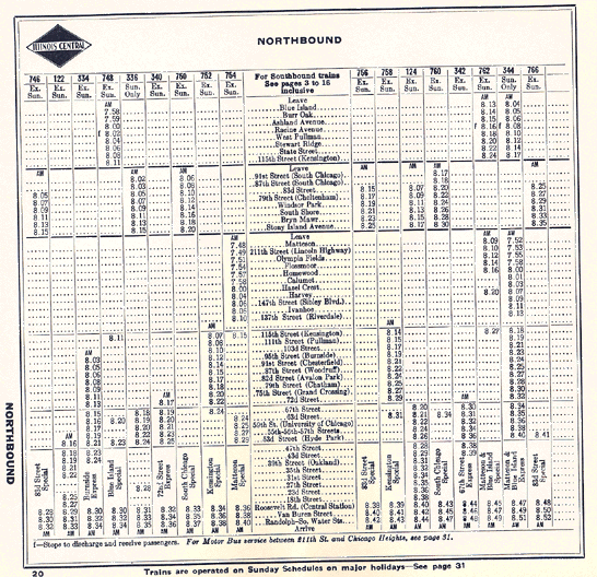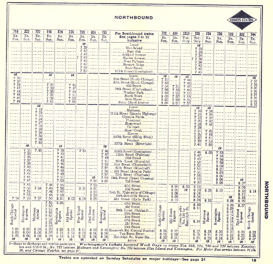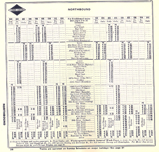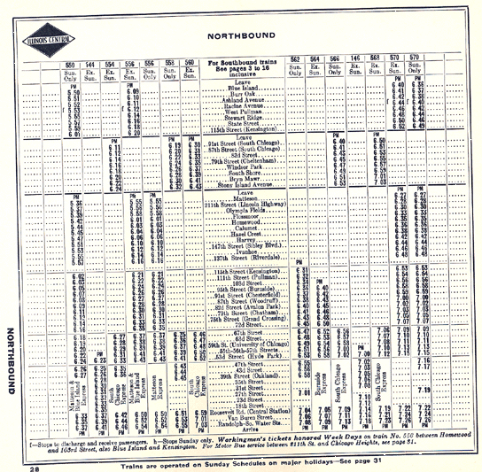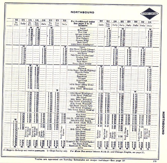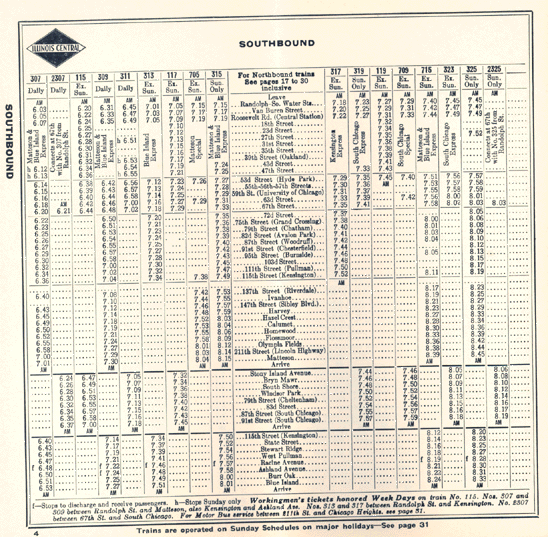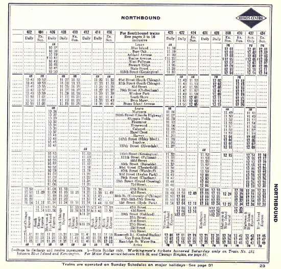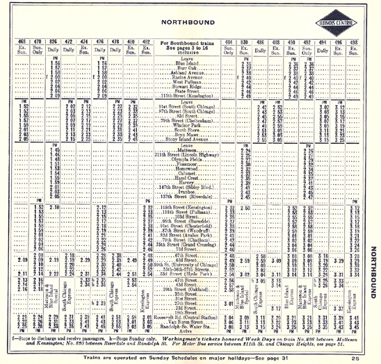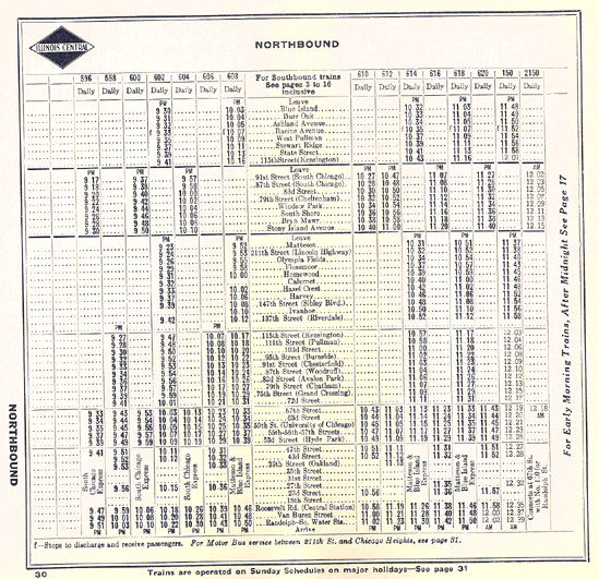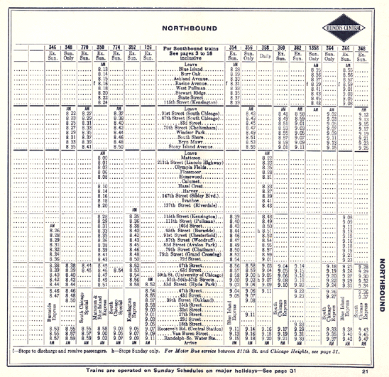 Pages of a 1939 timetable. Schedules for all different days of the week were lumped together. At the time, trains on the South Chicago Branch operated every ten minutes throughout the day.
