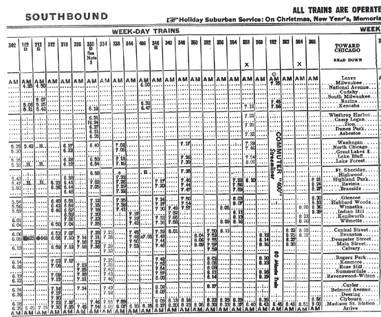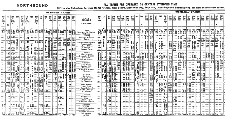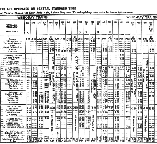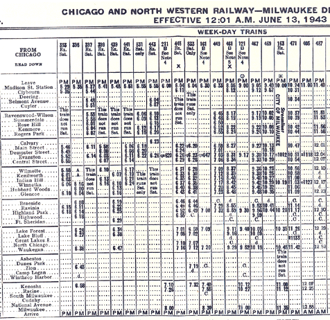 Portions of a 1943 timetable. Timetables for this line included trains to and from Milwaukee, until the discontinuance of those trains with the formation of Amtrak in 1971.