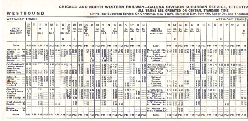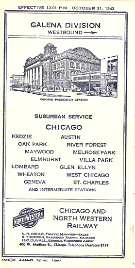 Portions of a 1943 timetable. At the time, some limited service existed via a branch north of Geneva to St. Charles.