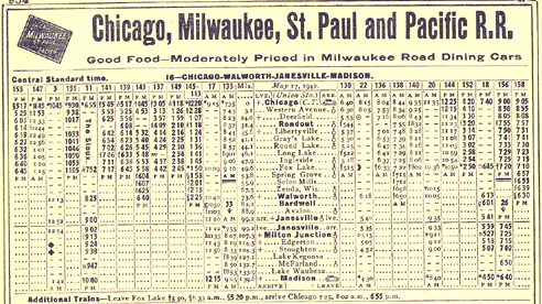 Portions of a 1942 Official Guide entry, also covering intercity trains. At the time, a few commuter trains operated beyond Fox Lake to Walworth, Wisconsin.