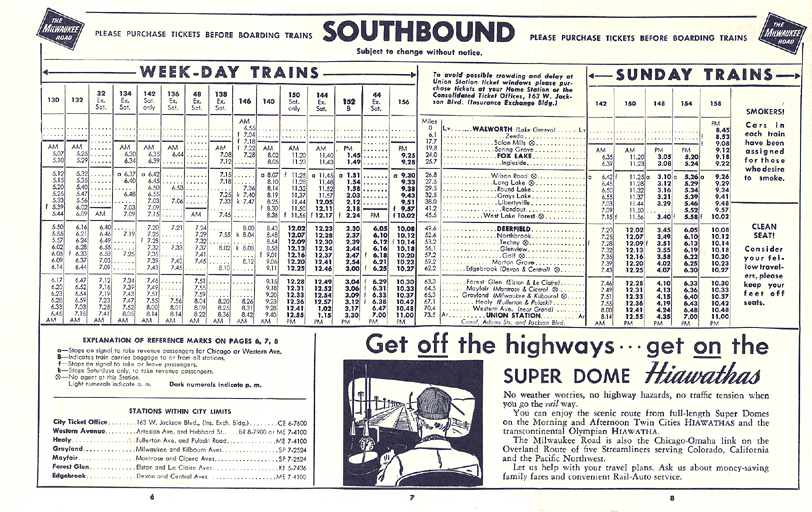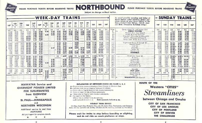 Portions of a 1957 timetable. At the time, a few trains operated beyond Fox Lake to Walworth, Wisconsin.
