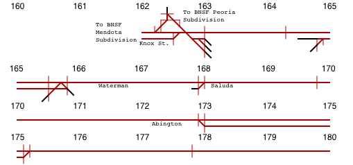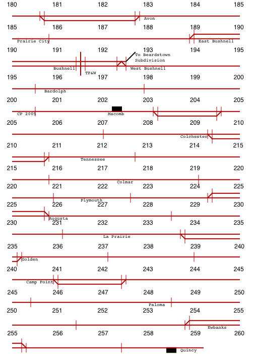 1 track, CTC in use, controlled by Kansas City District Dispatcher in Fort Worth, Texas. 2 tracks between East Bushnell and West Bushnell.