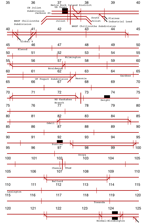Track diagram as the line existed around 1975, when sidings existed between Joliet and Mazonia. CTC was installed between Chicago and Joliet around 2000.