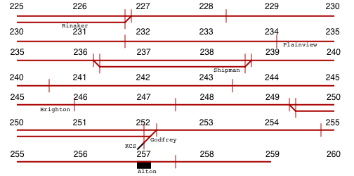 In 1881, the "cutoff" opened between Godfrey and Wann, bypassing the main part of Alton and presently used by Amtrak. While the original route through Alton was eventually abandoned. At its peak, the only single track segments were between Rinaker and Plainview, and between Godfrey and Wann. Early CTC installations on those segments were originally controlled from various towers as linked below.