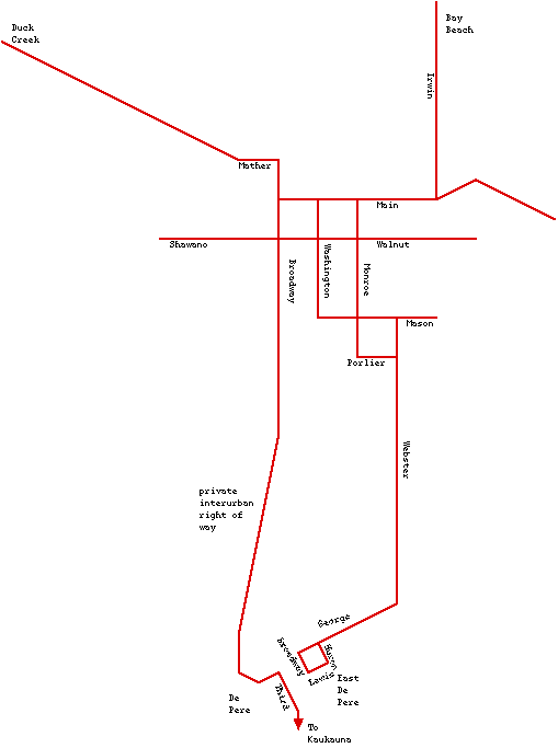 Map shows electric railway trackage in the Green Bay area, in red. Shown extending south of Green Bay is the interurban line to Kaukauna.