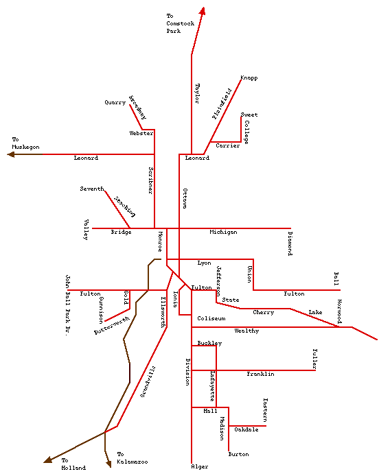 The Grand Rapids, Holland and Chicago Railway line to Holland originally exited Grand Rapids via the Grandville streetcar route. In 1915, the Michigan Railway line was completed to Kalamazoo, including a route out of downtown Grand Rapids using private right of way, also shown in brown. The Grand Rapids Holland and Chicago Railway also used this route from 1915 until its abandonment in 1926. And from 1926 until abandonment in 1928, the Kalamazoo interurban line used the Grandville streetcar route.