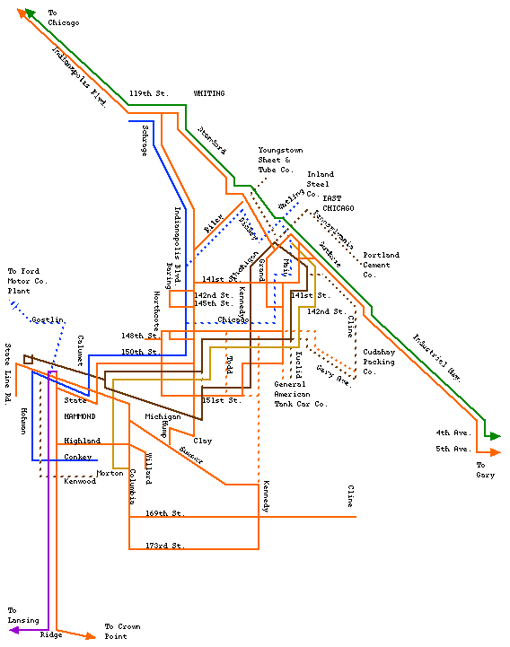 Several streets had routes from multiple predecessor bus companies. Most notably, several companies operated from downtown Hammond to downtown East Chicago, via State, Calumet, 150th St., Forsythe (now Indianapolis Blvd.), Chicago, Euclid, 141st St., Main, Guthrie.