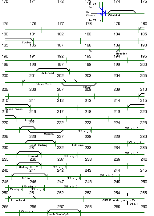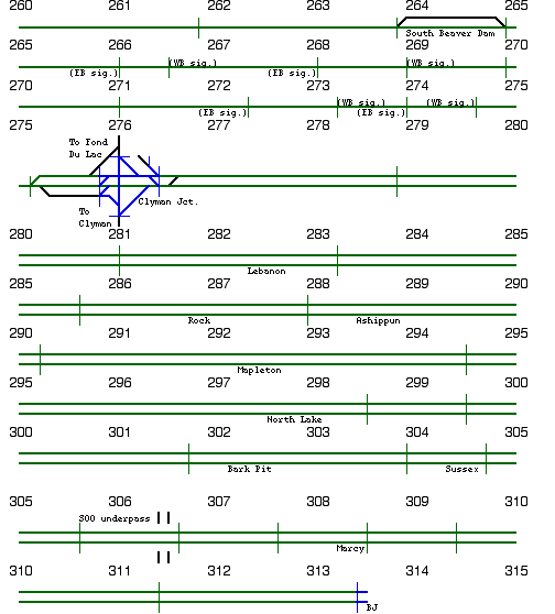 Chicago & North Western line from Milwaukee to Wyeville, as it existed during 1950's when line had sidings and more closely spaced signals, and double track between Milwaukee and Clyman Jct. The double track was eliminated around 1958, this information is mostly based on a 1959 track chart which shows the entire line as single track. The track chart shows most signals in the former double track segment as bridges, presumably bridges designed for double track left hand operation. All such signal bridges are indicated on this diagram, not known is whether signals existed for both tracks or just one track. Most likely, closely spaced signal bridges held a signal for just one track.