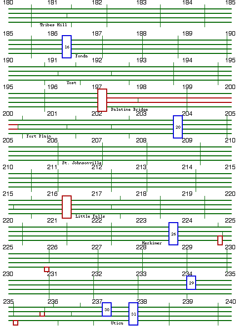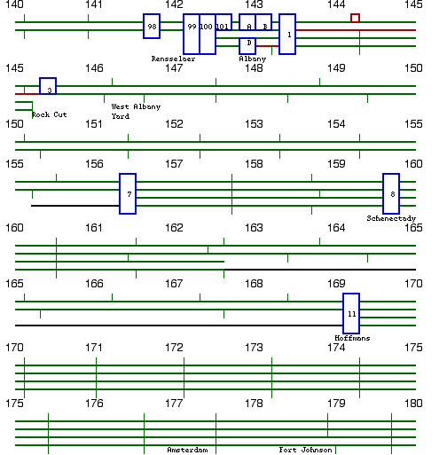 Unlike other track diagrams at this Web site, these track diagrams do not include switches, especially at interlockings, due to an unavailability of older track charts. But employee timetables included locations of all signals. Manual interlockings with towers are indicated with blue rectangles, interlockings were identified by number or letter included within the rectangles. Remote interlockings are indicated with red rectangles.