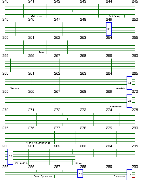 Former New York Central main line between Albany and Syracuse. At the time, much of the route had four tracks. Where four tracks existed, the south pair of tracks were used by passenger trains, and the north pair of tracks were used by freight trains. Unusual is that the freight trains used left hand operation, meaning that the inside tracks were westbound and the outside tracks were eastbound. Two tracks are shown through Syracuse, because passenger trains passed through downtown Syracuse, while freight trains used a separate route passing north of Syracuse. In the early 1970's, an expressway was constructed where the line through downtown Syracuse had existed, and passenger trains began using the freight route.