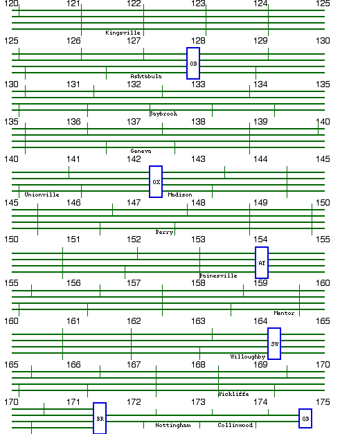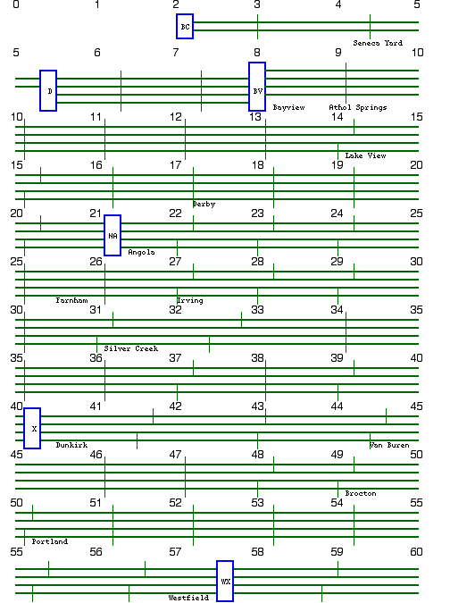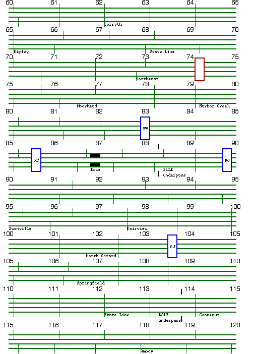 Unlike other track diagrams at this Web site, these track diagrams do not include switches, especially at interlockings, due to an unavailability of older track charts. But employee timetables listed signals and their numbers. But many signal locations are estimated, because New York Central signal numbers only conveyed whole miles, instead of the more usual numbering of signals to the nearest odd or even tenth of a mile. In addition, the employee timetables contained some inconsistencies. Manual interlockings with towers are indicated with blue rectangles, interlockings were identified by letter code included within the rectangles. Remote interlockings are indicated with red rectangles.